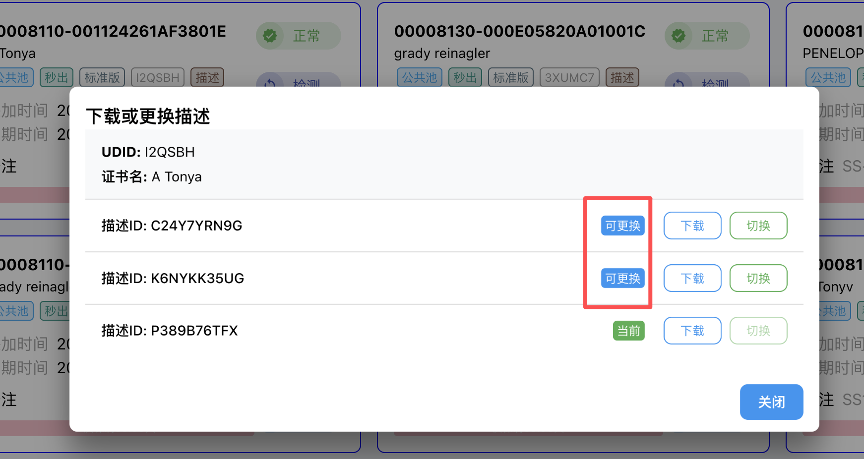 “切换”:在站点数据库中替换为新的描述文件,用户再从站点下载证书/简易签名/接口获取证书等均会使用切换后的证书